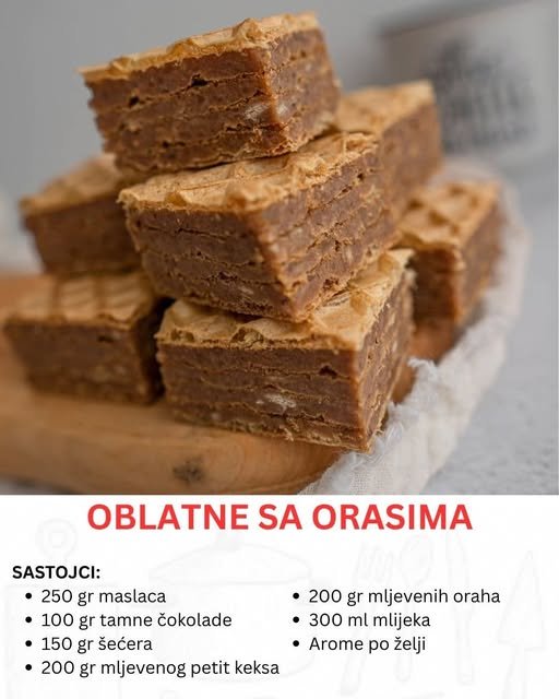 Ono što čini oblatne sa orasima posebnima jeste ravnoteža između slojeva i bogatstvo mirisa. Kada zagrizete prvi zalogaj, osjetite blagu hrskavost oblatne koja brzo prelazi u kremastu mekoću fila. Maslac i čokolada daju mu glatkoću, orasi pružaju dubinu i zemljani ton, dok rum ili vanilija doprinose da svaki zalogaj bude topao, mirisan i prepoznatljivo domaći.