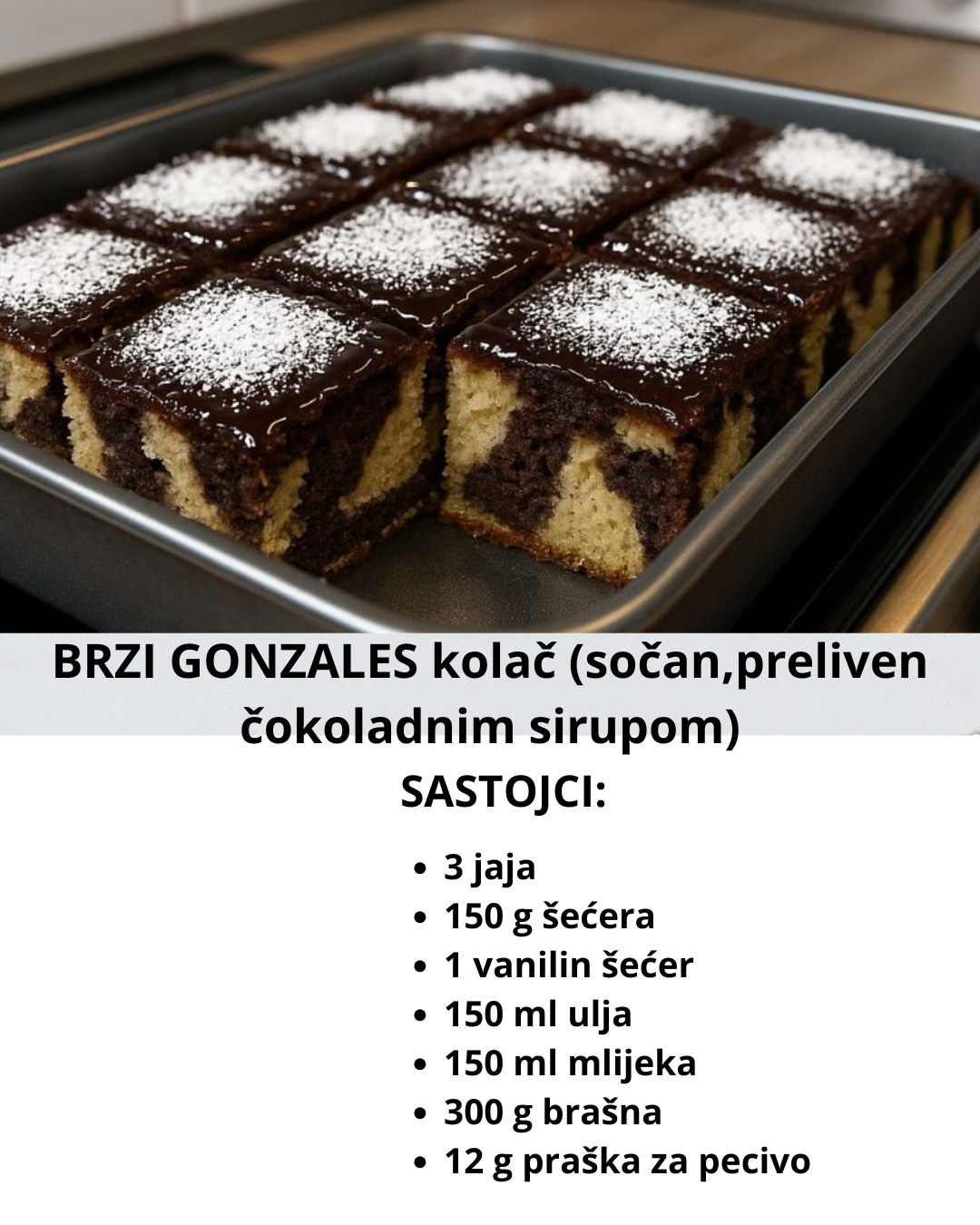Brzi Gonzales je jedan od onih kolača koji se prave „iz rukava“ – bez komplikacija i dugačkog mućenja, a rezultat je mekan, sočan i predivno čokoladan kolač koji se preliva vrućim prelivom. Idealno za kada želite nešto brzo, jednostavno, a efektnog ukusa! Peče se kratko, sastojci su osnovni, i uvek ispadne savršeno. Ovaj recept je originalno delila J. Nermina i postao je pravi hit među ljubiteljima brzih kolača.