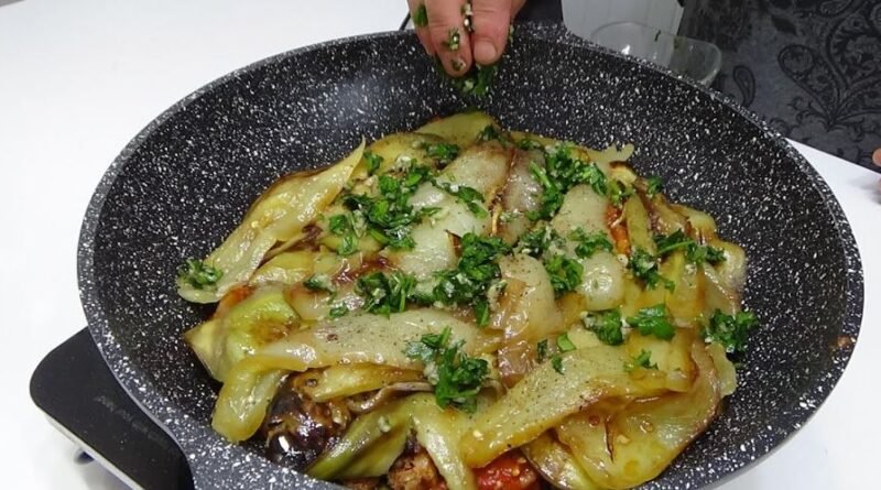 Priprema: Očistite i poslolite, a zatim isecite patlidžan na kriške. Prepržite ga na ulju. Zatim ga sklonite sa strane, a u tom istom tiganju ispržite paprike koje su isečene na trake. Posle njih isecite kobasice pa ih ispržite.