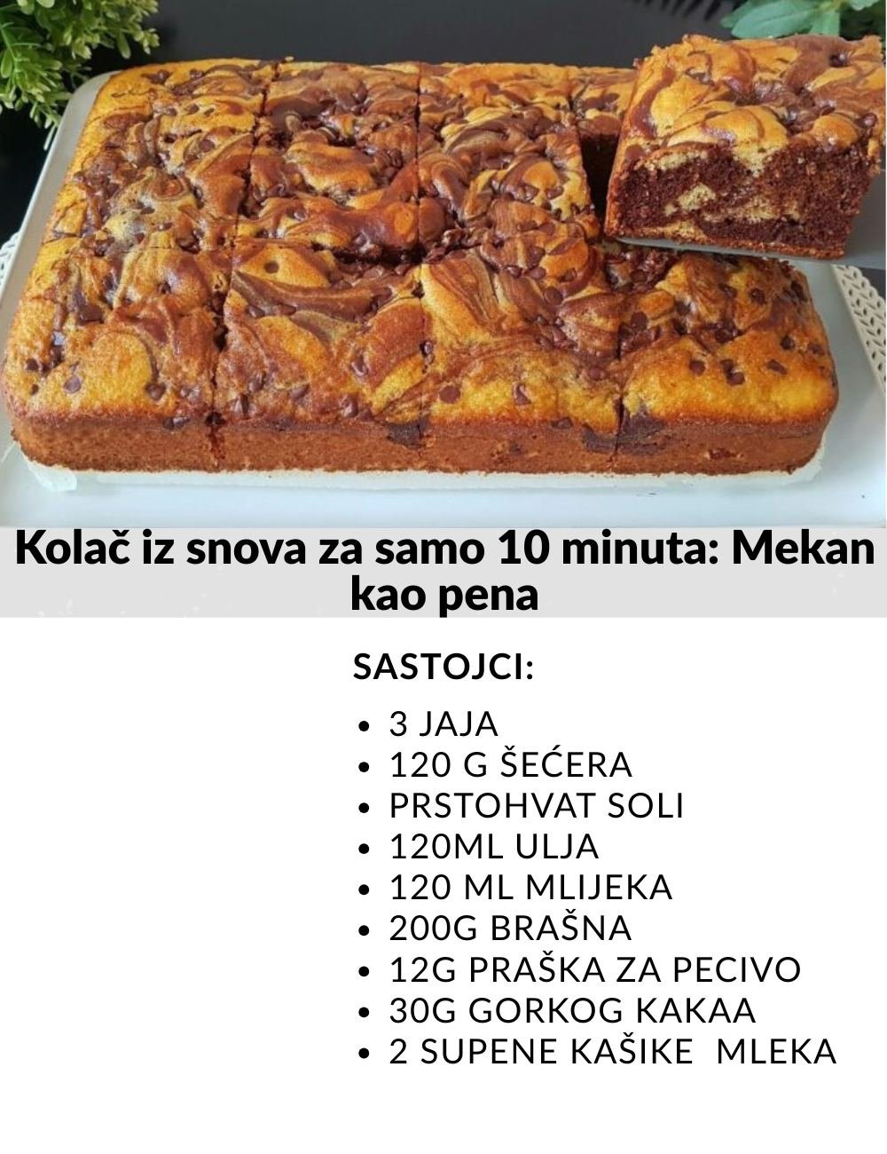 Sastojci: 3 jaja 120 g šećera prstohvat soli 120ml ulja 120 ml mlijeka 200g brašna 12g praška za pecivo 30g gorkog kakaa 2 supene kašike mleka aroma kafe ili kašičica instant kafe čokoladni komadići Pogledajte video recept sa pripremom. Recepti peciva