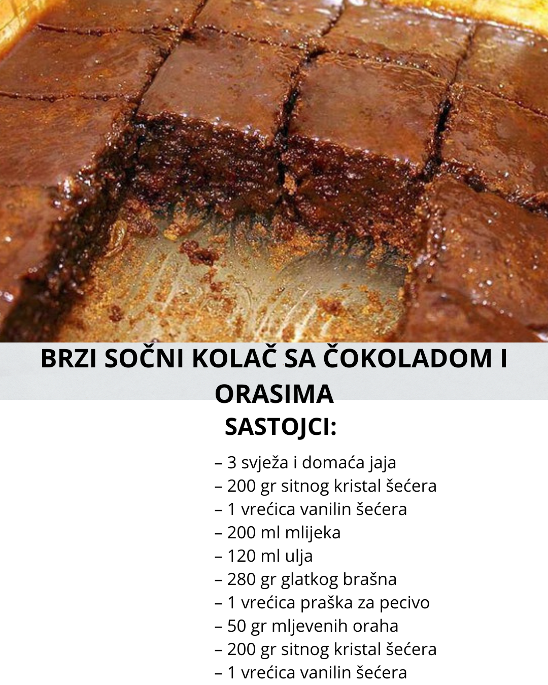 BRZI SOČNI KOLAČ SA ČOKOLADOM I ORASIMA