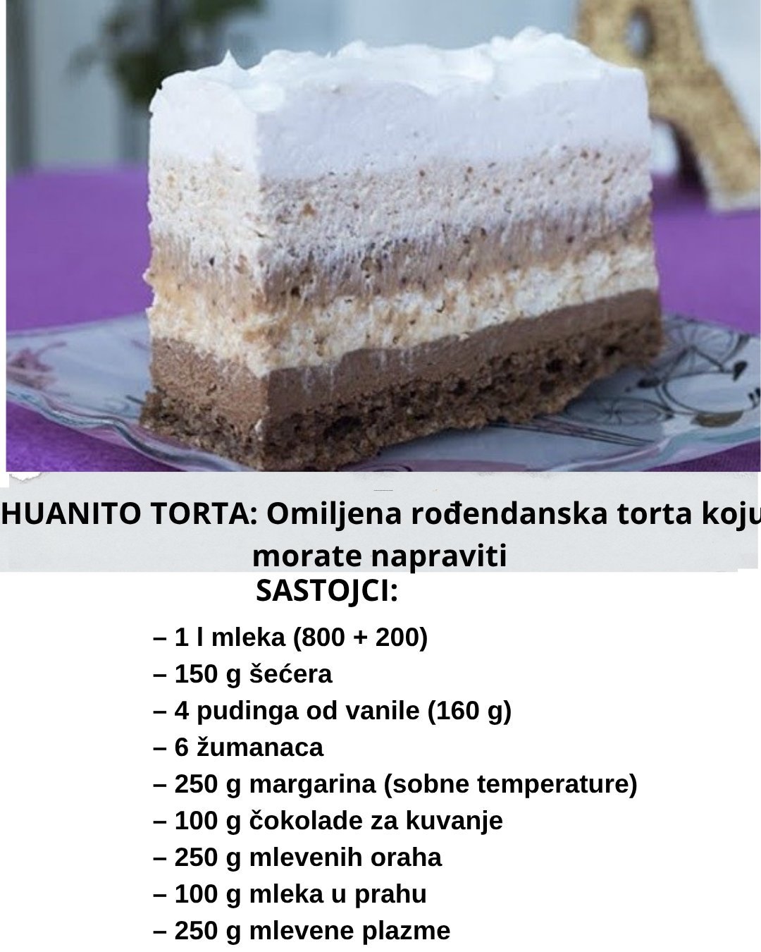 Svečana posna torta (bez mleka i jaja). Torta bez mleka i jaja, najukusnija posna verzija. Volim što svako parče lepo izgleda a opet je sočno i kremasto. Sastojci i priprema: Kora: 500 ml. vode 150 gr. šećera 1 vanilin šećer 4 kašike kakaa 320 gr. brašna 3 kašike ulja pola kesice praška za pecivo (1 … Read more