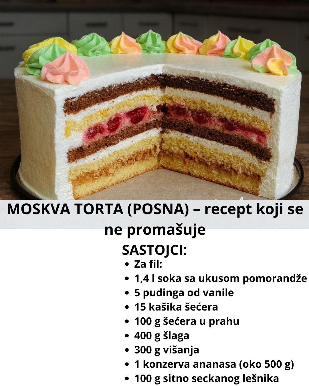 Sastojci za tijesto:1kg brašna,5 šoljica (3 dcl) ulja,0.5l čaja od kamilice (ili bilo kog drugog),6 kašika šećera,1 kocka germe,1 kesica vanilijong šećera,dodaci: malo soli (1/2 kašičice), nastrugana limunova korica.Sastojci za fil:4 X 200gr mljevenih oraha, maka, rogača, lješnika,4 X 3 kašike šećera,7 dcl vruće vode.