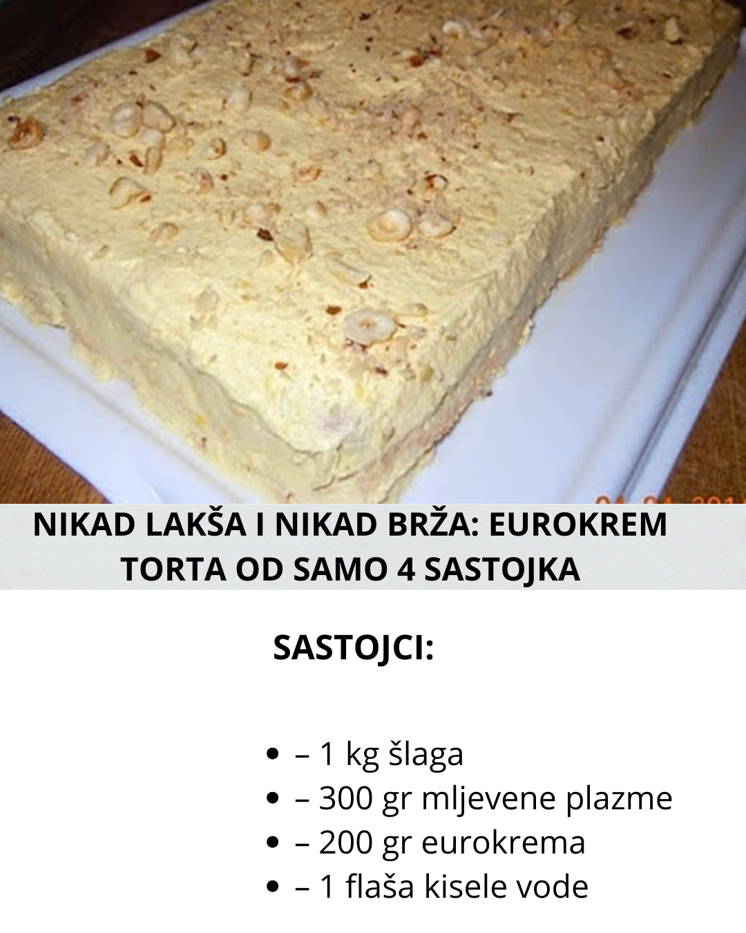 400 gr šlaga umutite sa 3 dcl kisele vode, dodajte eurokrem i premazati koru od plazme.