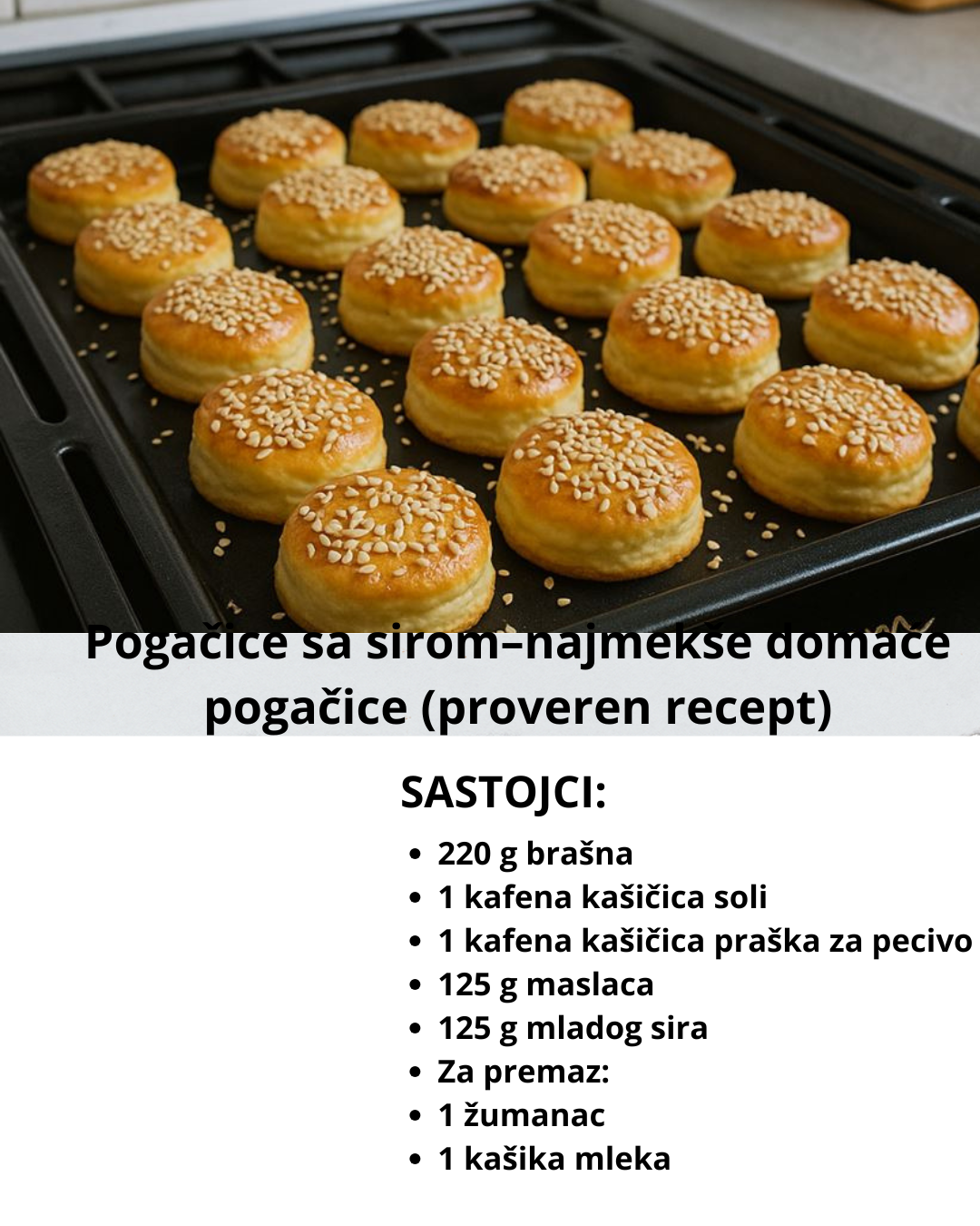 Domaće pogačice sa sirom su klasik koji se pravi brzo, jednostavno i uvek oduševi. Mekane iznutra, blago hrskave spolja, idealne su za doručak, večeru, posluženje uz čašu jogurta, predjelo, ili kao slano posluženje za goste. Ove pogačice su bogate sirom i puterom, prave se bez čekanja da testo raste i gotove su za samo 20 minuta pečenja. Najbolje od svega – potrebni su samo osnovni sastojci i rezultat je uvek savršeno mekano i ukusno testo.