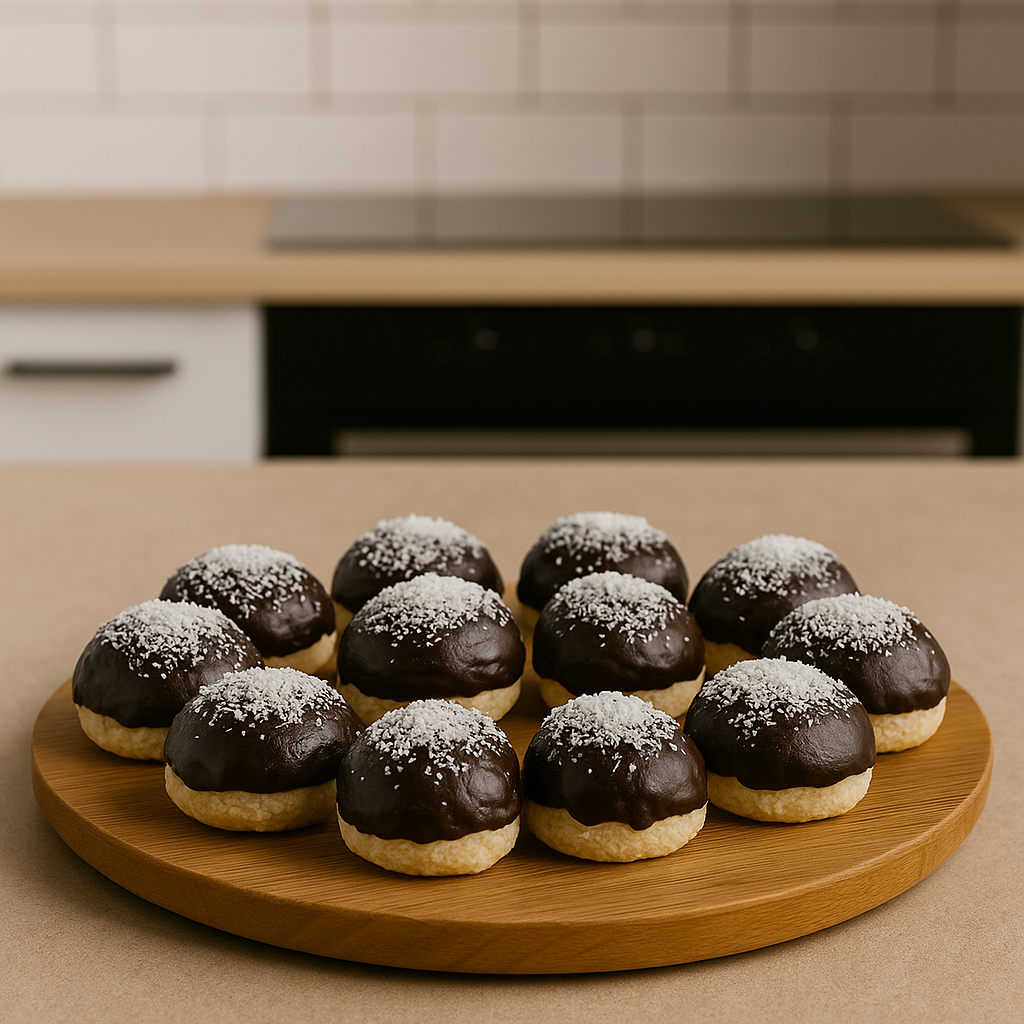Ohladjene „pečurke“ umočite u čokoladu sa gornje strane i odmah pospite kokosom.