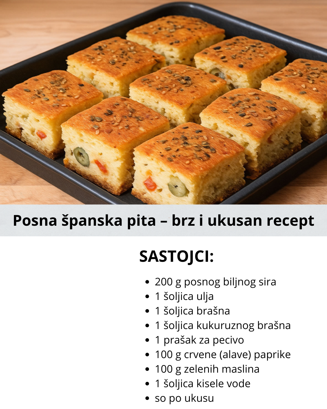 Ako želite slanu poslasticu koja je istovremeno posna, sočna i jednostavna za pripremu, onda je posna španska pita pravi izbor. Ovaj specijalitet je odličan za dane posta, ali i kao brzi ručak ili večera. Lako se pravi, a kombinacija povrća, maslina i posnog sira daje joj bogat ukus kojem je teško odoleti.