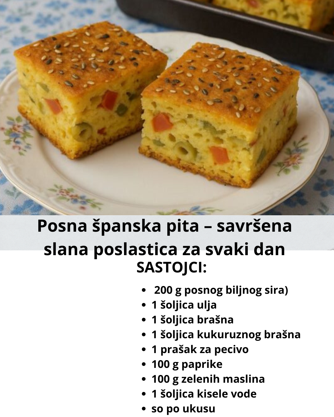 Ovo je jedan od onih posnih recepata koji oduševi i one koji ne poste. Posna španska pita je mekana, sočna, aromatična i prepuna boje — savršen izbor za brzi doručak, večeru, meze, posluženje za goste ili posnu trpezu. Biljni sir, alava paprika i zelene masline daju pun ukus i mediteranski pečat, a priprema traje samo nekoliko minuta. Sve se sjedini u jednoj činiji, izlije u tepsiju i peče — jednostavno, brzo i uvijek uspije!
