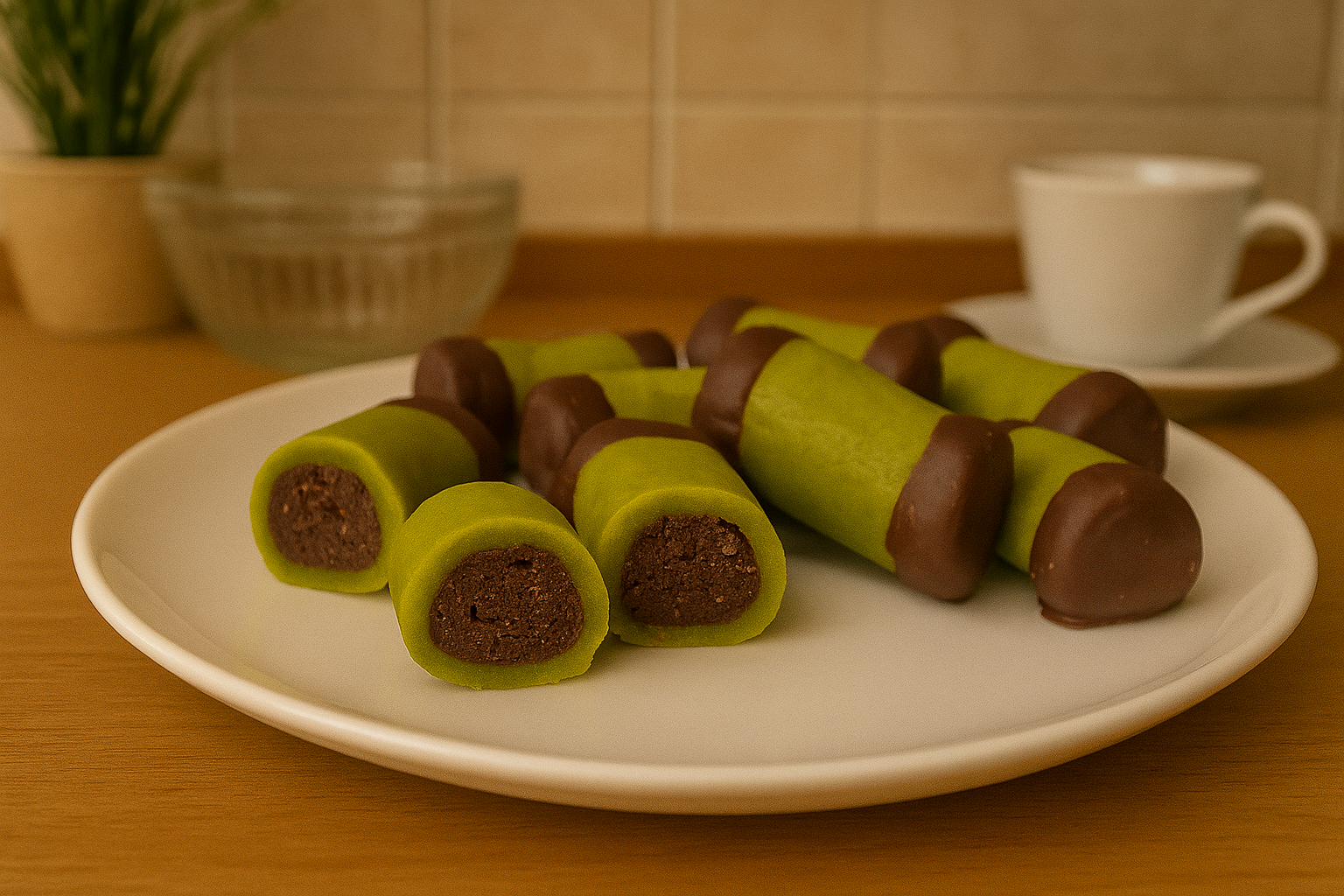 Na foliju ili pek papir razvaljaj zelenu masu u pravougaonik debljine oko 0,5 cm.