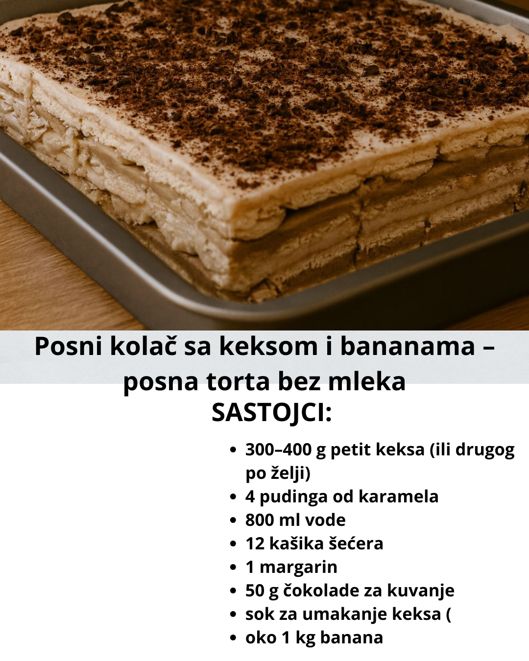 Ako tražite savršen recept za posnu tortu koja je istovremeno kremasta, osvežavajuća i jednostavna za pripremu, onda je ovaj posni kolač sa keksom i bananama pravi izbor! Umesto mleka koristi se voda, a puding, čokolada i banane daju bogat i pun ukus. Idealna je za posne slave, praznike ili kada želite lagani desert koji se brzo pravi, a svi ga obožavaju.