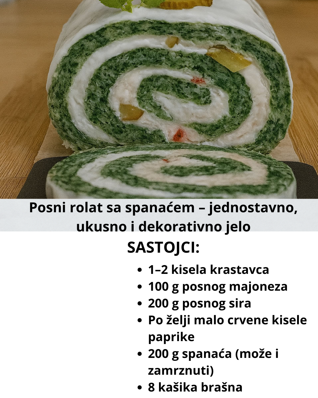 Napomena: umjesto spanaća možete koristiti 4 kašike ajvara – dobićete ukusnu crvenu posnu rolnu!