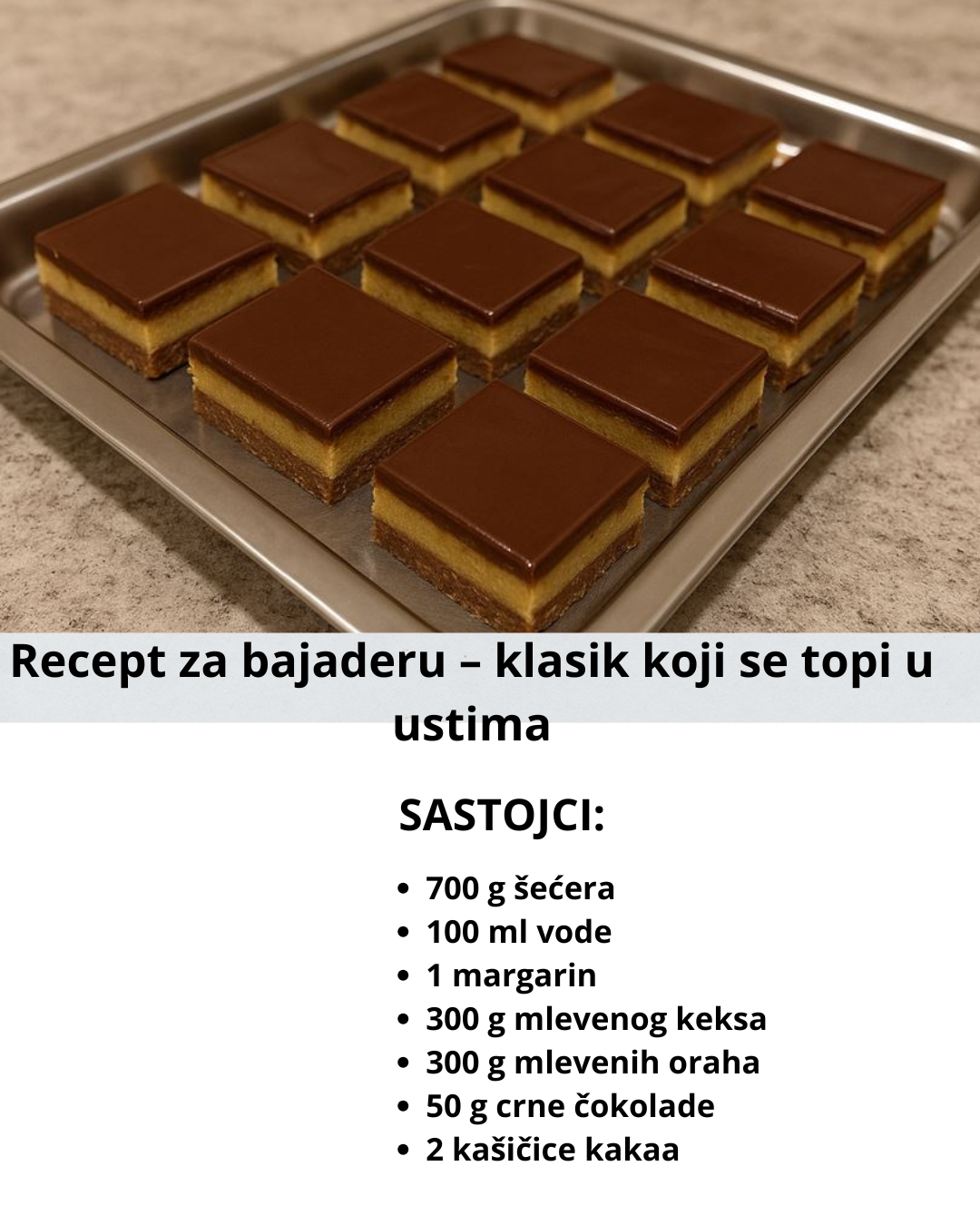Ako volite tradicionalne poslastice koje se prave brzo i bez rerne, bajadera bez pečenja je pravi izbor za vas! Priprema je jednostavna, ne zahteva pečenje ni posebne veštine, a rezultat je savršeno elegantan kolač koji krasi svaku trpezu, bilo da je reč o praznicima, slavi ili porodičnom okupljanju. Bajadera se lako pravi, predivno se seče i dugo zadržava svežinu, pa je idealna za sve prilike kada želite desert koji oduševljava ukusom i izgledom.