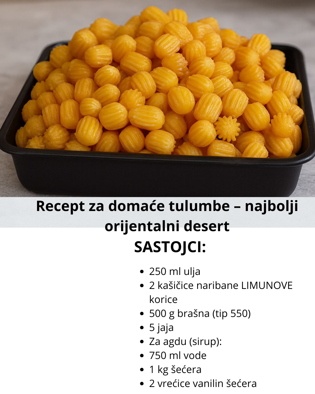 U nastavku donosimo tradicionalni recept za tulumbe sa agdom, koji se lako priprema i ne zahtijeva skupe sastojke.