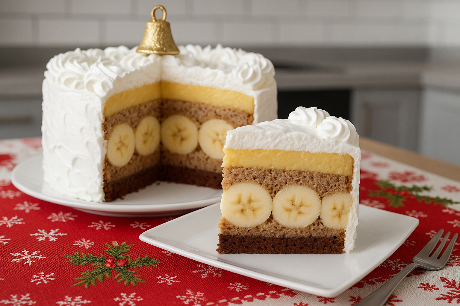 Dobiješ prelepu, sočnu, tanko sečenu tortu sa celim bananama u preseku — prava posna bomba!