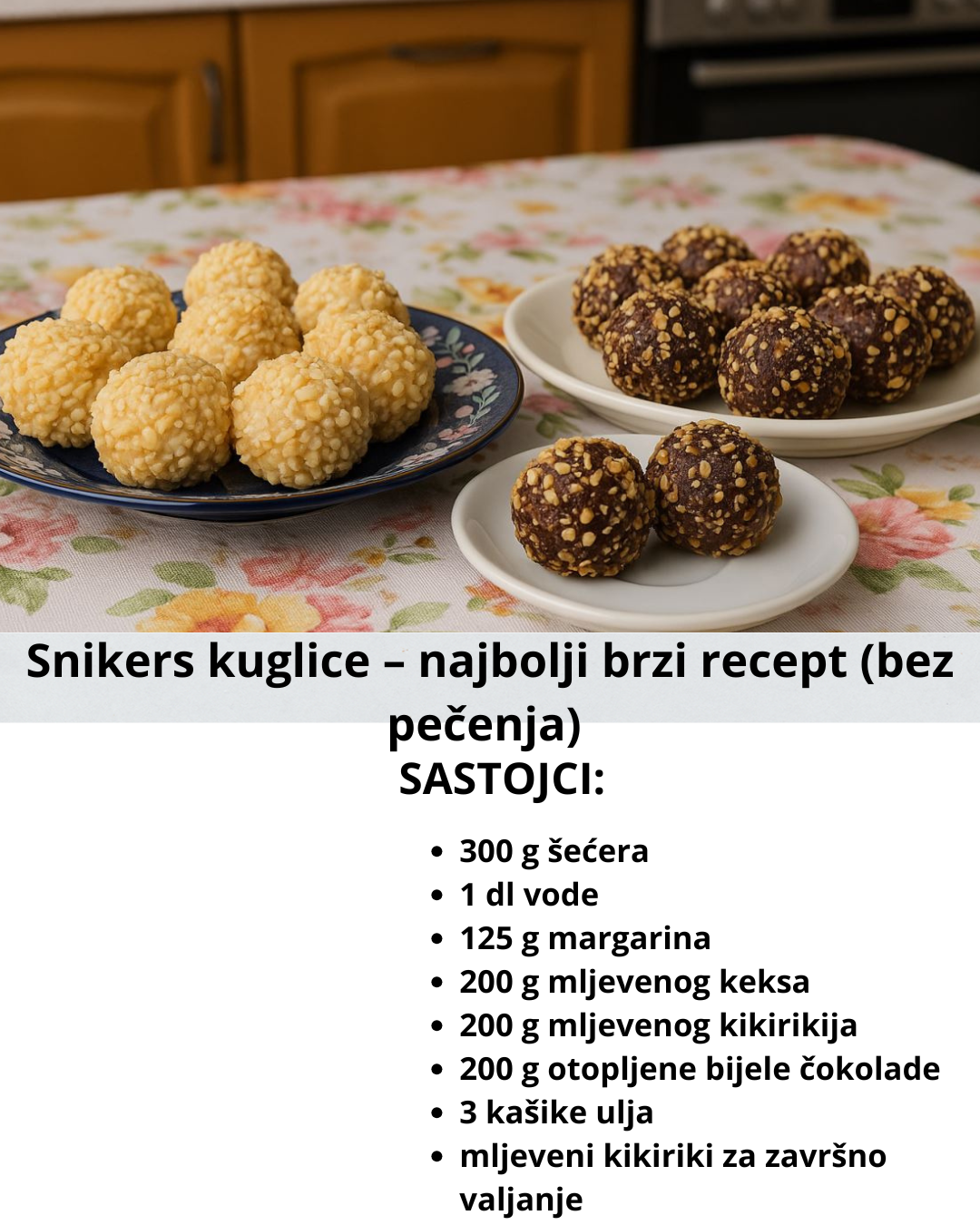 Snikers kuglice su jedan od najpopularnijih malih kolača za svečane tacne. Ovo je idealan recept za „kikiriki kuglice“, „Snikers bombice“, „brze kuglice bez pečenja“ i „kuglice sa belom čokoladom“. Spremaju se brzo, bez rerne, od samo nekoliko sastojaka – a rezultat je savršena kombinacija kikirikija, keksa i čokolade. Odlične su za slave, praznike, rodjendane, Novu godinu i kao sitni kolači za dekorativne tacne.