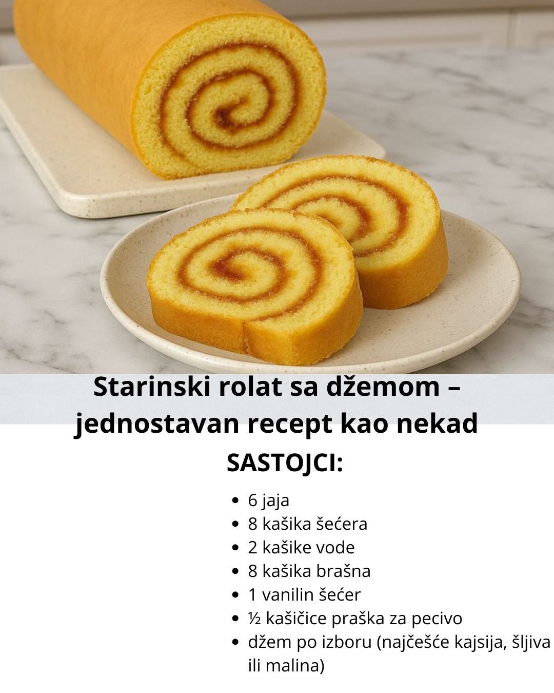 Ako volite mekane, mirisne kolače iz detinjstva, onda je ovaj starinski rolat sa džemom pravi izbor za vas. Lagan, sočan i nežan, ovaj rolat se pravi od nekoliko osnovnih sastojaka koje svi imamo kod kuće. Savršen je uz šolju kafe ili čaja, a još lepši kada se posluži posut prah šećerom.