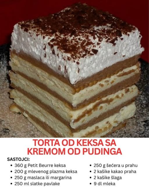 U ovom receptu, sve je pažljivo uklopljeno: od korica napravljenih od Petit Beurre keksa, do slojeva kremastog pudinga i dodatka ruma koji daje diskretnu aromu i notu topline. Ova torta se ne peče, što je čini idealnom i za one dane kada želite desert koji izgleda raskošno, a ne zahteva dug boravak u kuhinji.